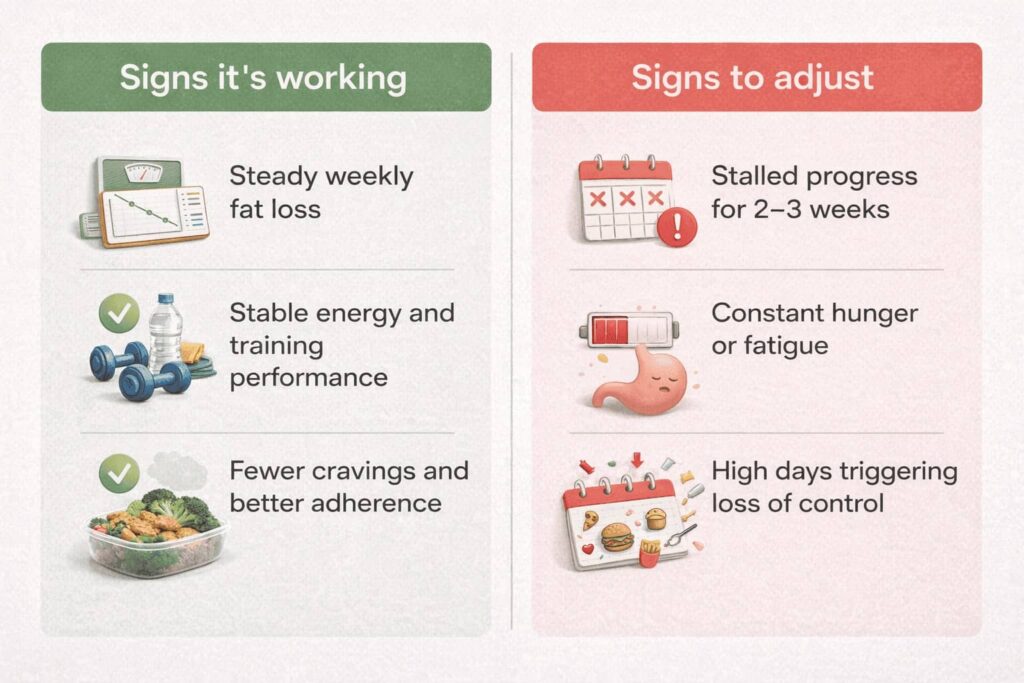 Many people use calorie cycling for 8–16 weeks during a fat-loss phase, then reassess. It can also be used long-term at maintenance to balance fitness goals and social life.